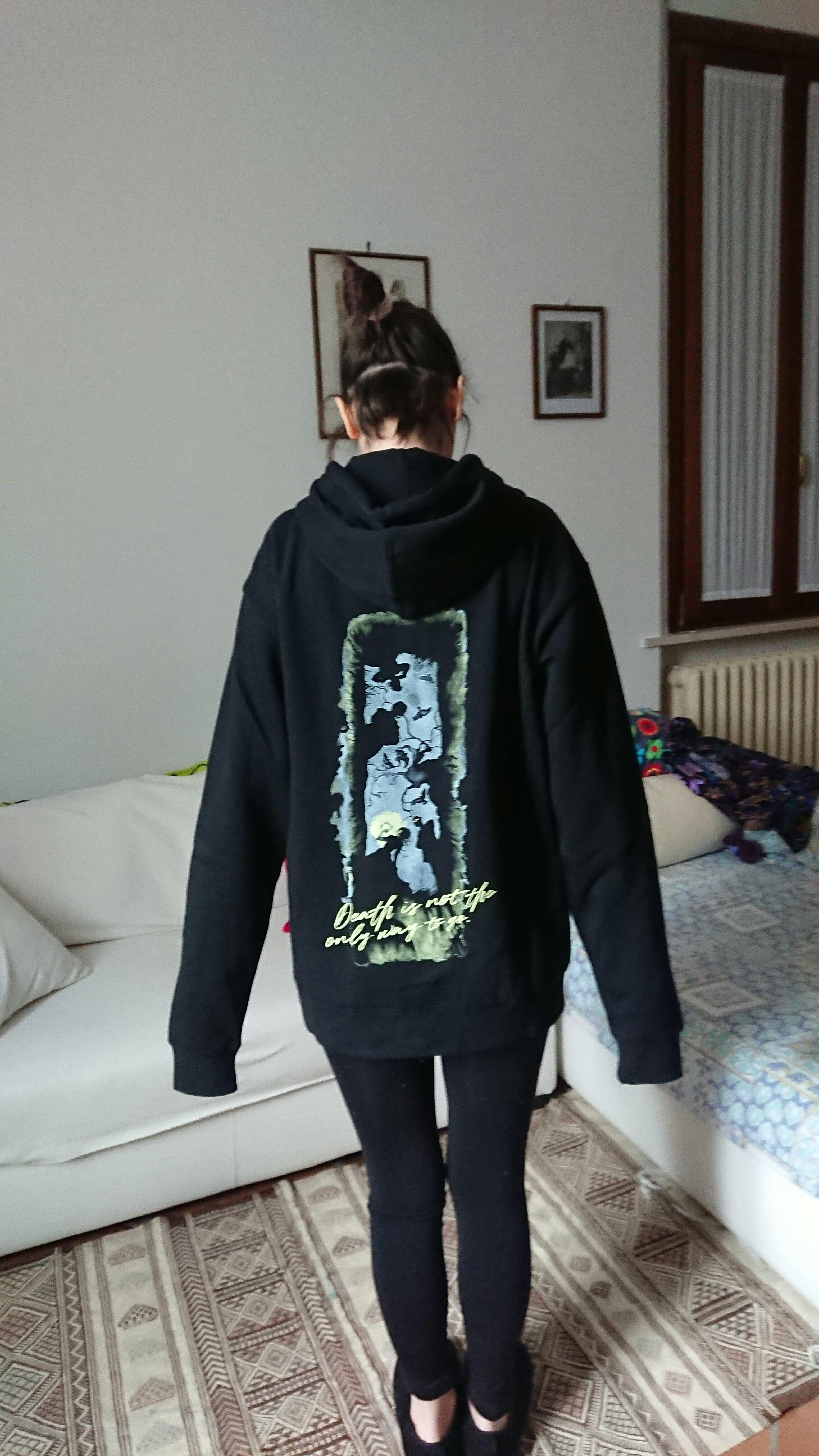 Members only! Secretly sort yourself as an investigator of occult magick by sporting this comfortable Candela Obscura black zip closure hoodie featuring a full hood with drawstrings, as well as ribbed cuffs and waistband. The official logo is embroidered on the front left chest area, and the back displays a large screen printed illustration of a worm’s eye view of a Candela Obscura circle peering into a grave. A scrawling hand across the illustration reminds us "Death is not the only way to go.”