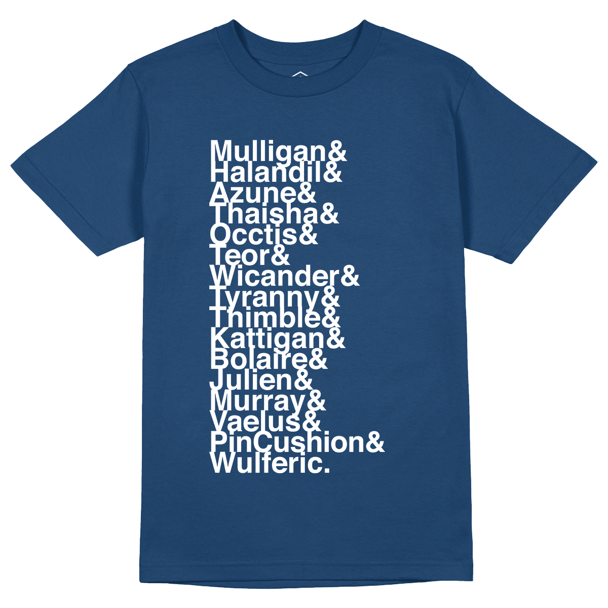 Celebrate the dawn of Campaign 4 with this relaxed, minimalist designed t-shirt that unites the past with the present (IYKYK). It features a sleek ampersand text illustration of the name of our new fearless game master, as well as the heroic adventurers and animal familiars beginning their journey through Aramán
