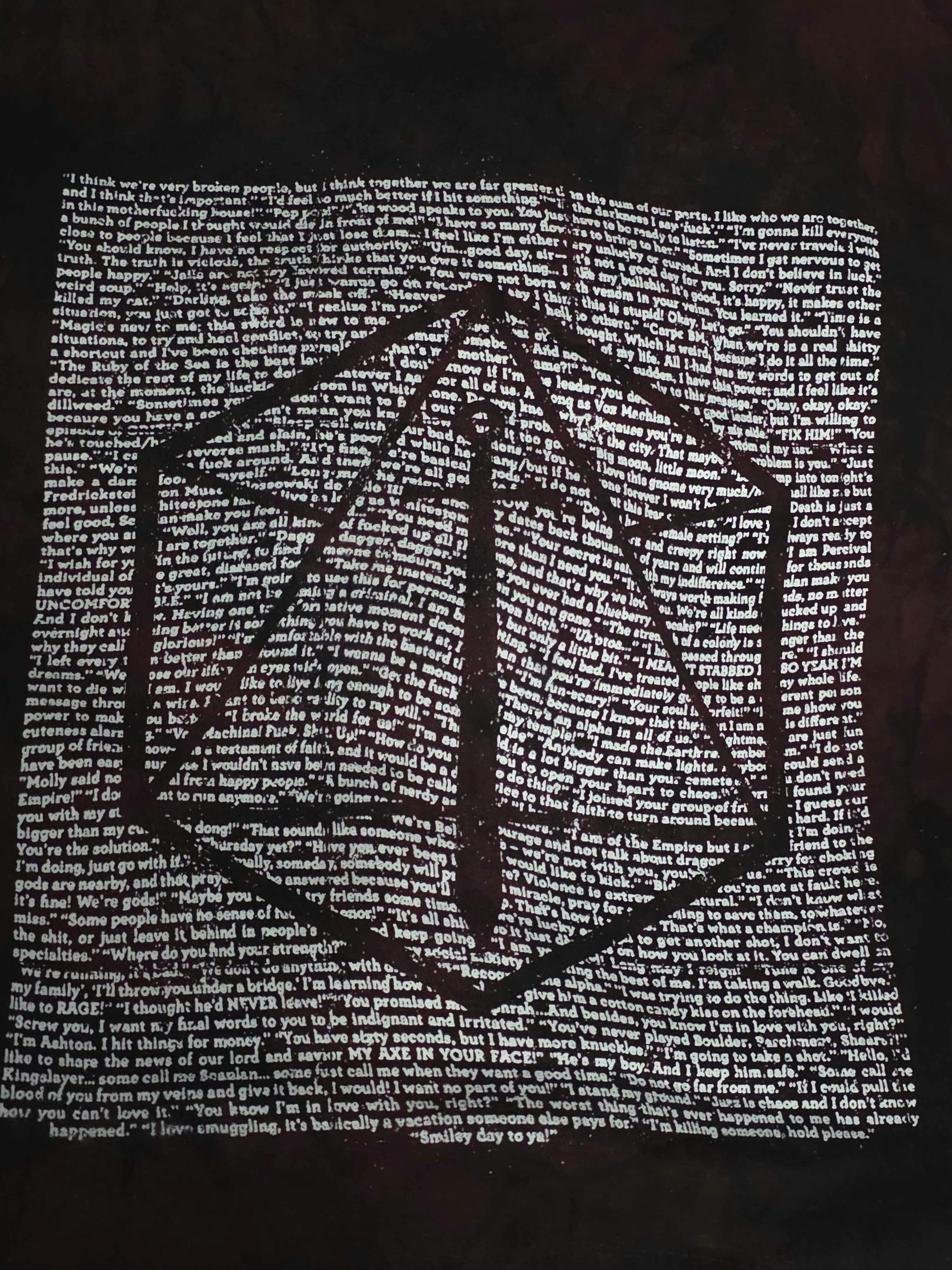 Join in our recollection of 10 years of infinite memories rocking this celebratory maroon and black tie-dye pullover hoodie. The back of the hoodie features dozens of unforgettable quotes from some of your favorite characters across all 3 Campaigns stylized to create the Critical Role logo in the negative space. The front of the hoodie has a screenprint of Critical Role written on the front chest just above a cozy kangaroo pocket.