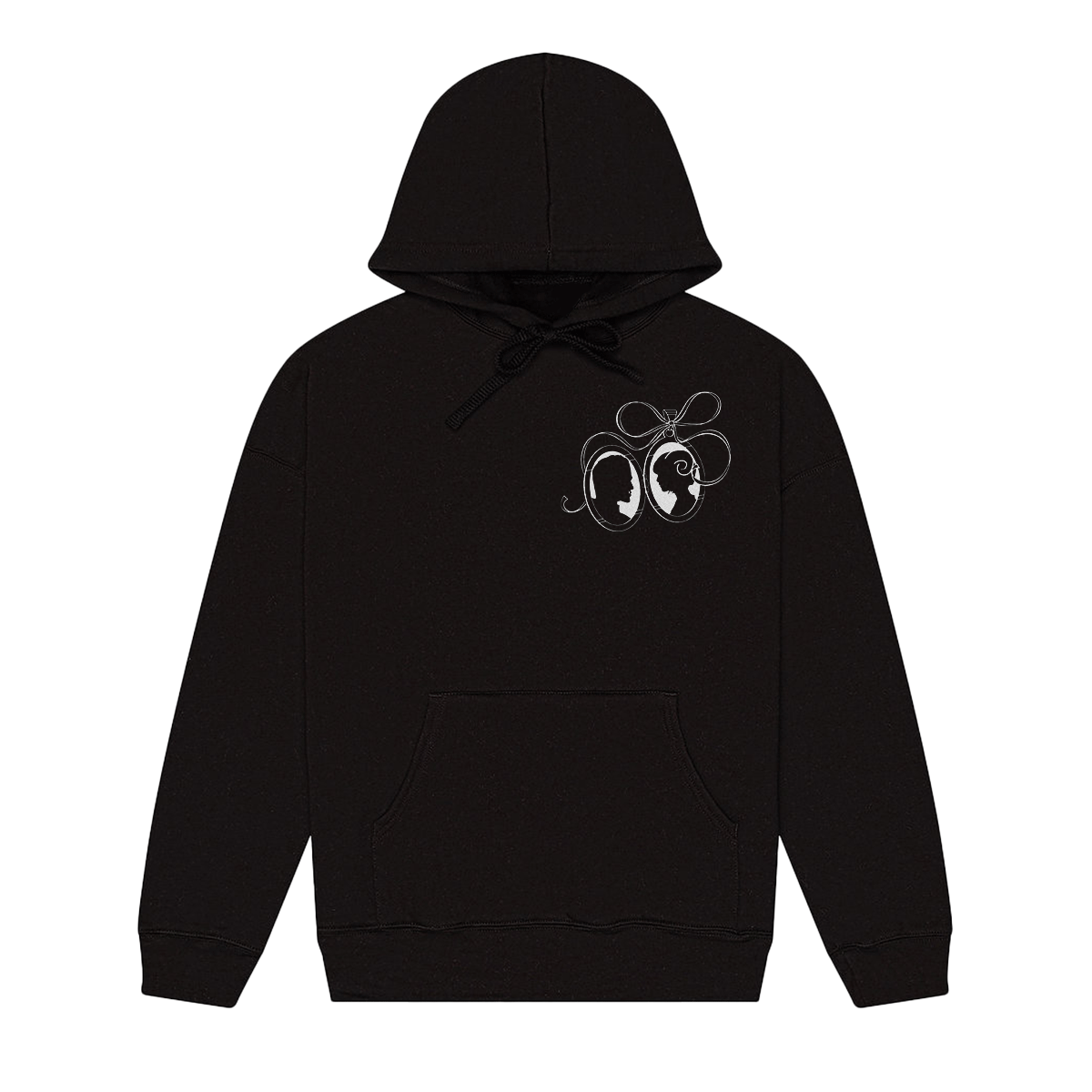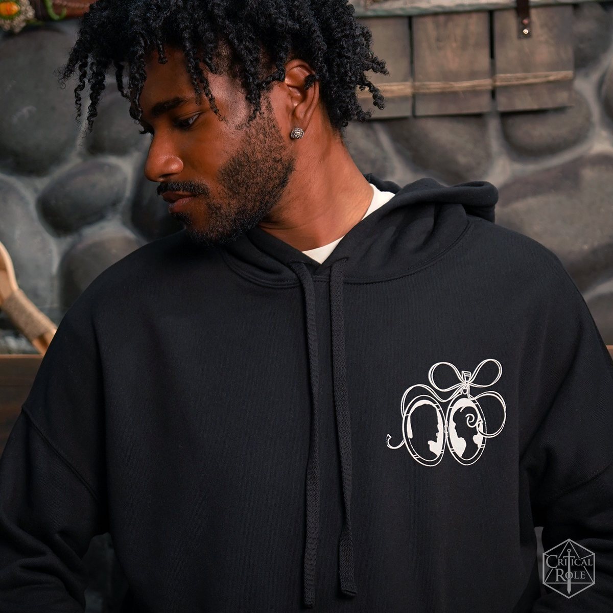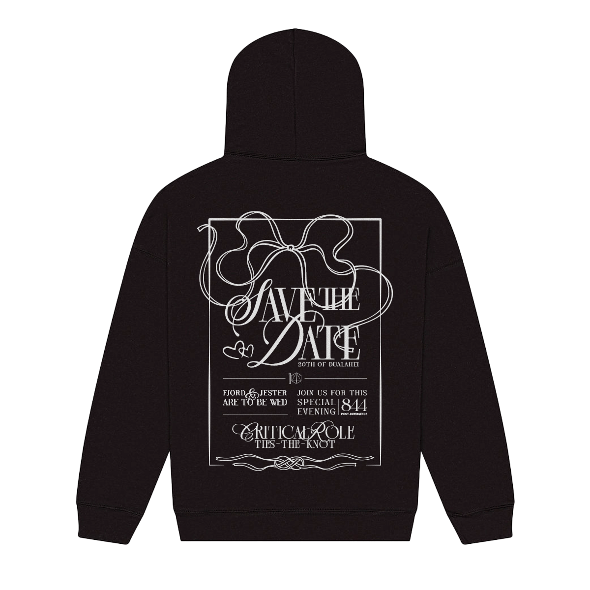 Wrap yourself in commemorative love rocking this cozy black, drop shoulder pullover hoodie with an open locket design of Fjord Stone and Jester Lavorre’s silhouettes on the front and a large graphic text design of the save-the-date wedding invitation details on the back.
