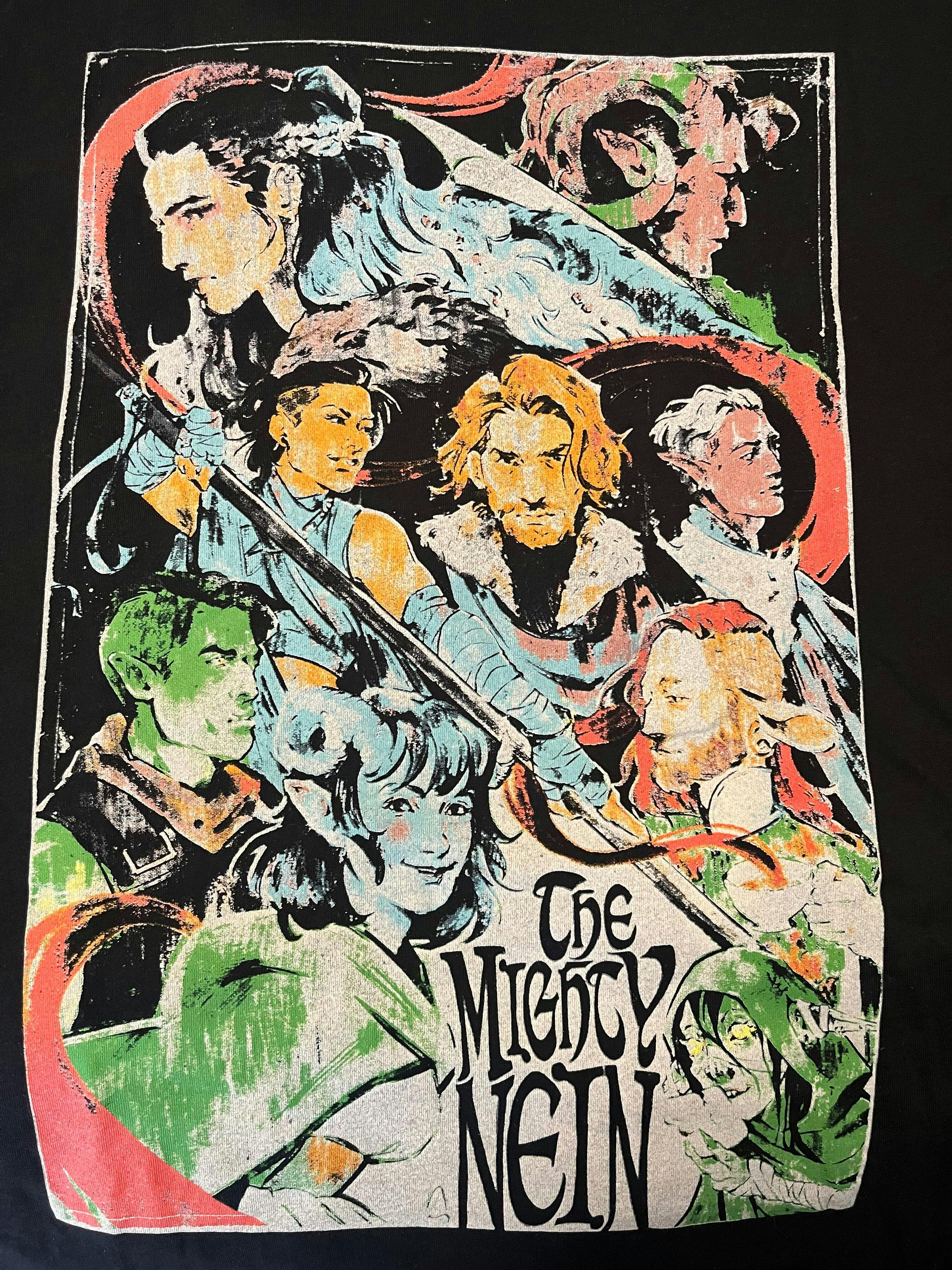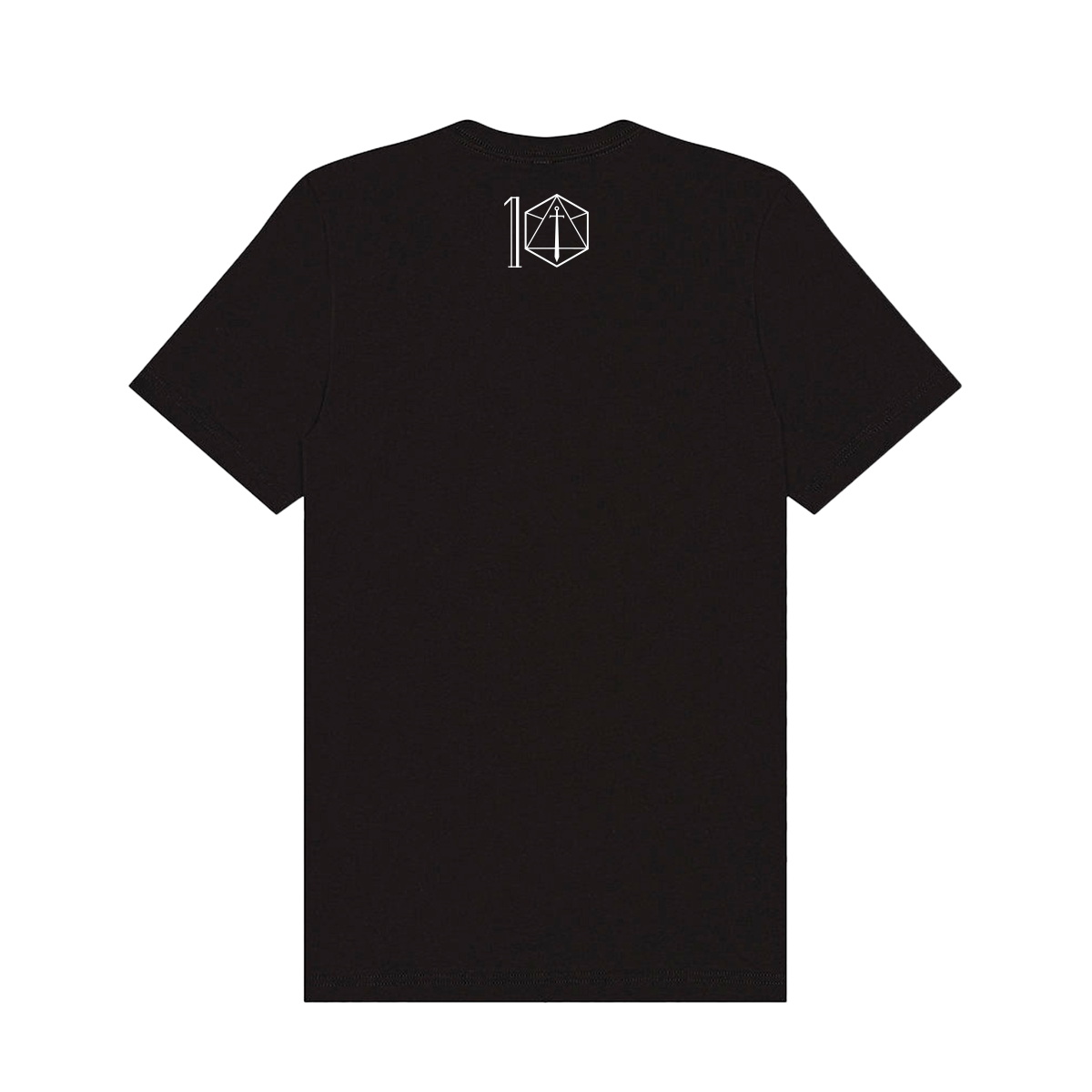 This unisex, black t-shirt features a large, vintage movie poster style screen print illustration of the Mighty Nein on the front and the official Critical Role 10 Year Anniversary logo on the back.