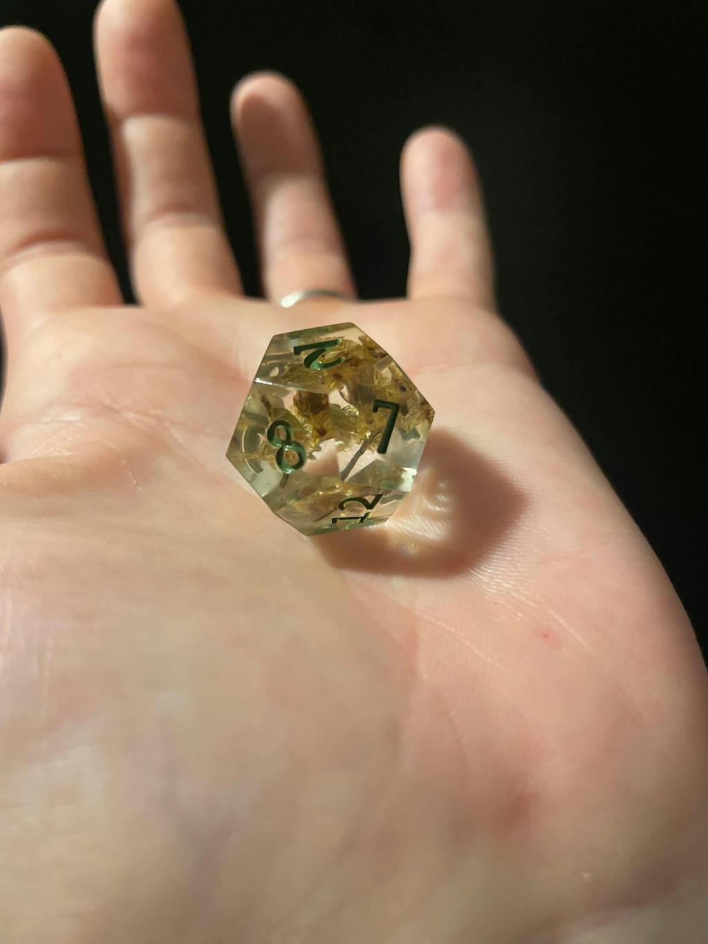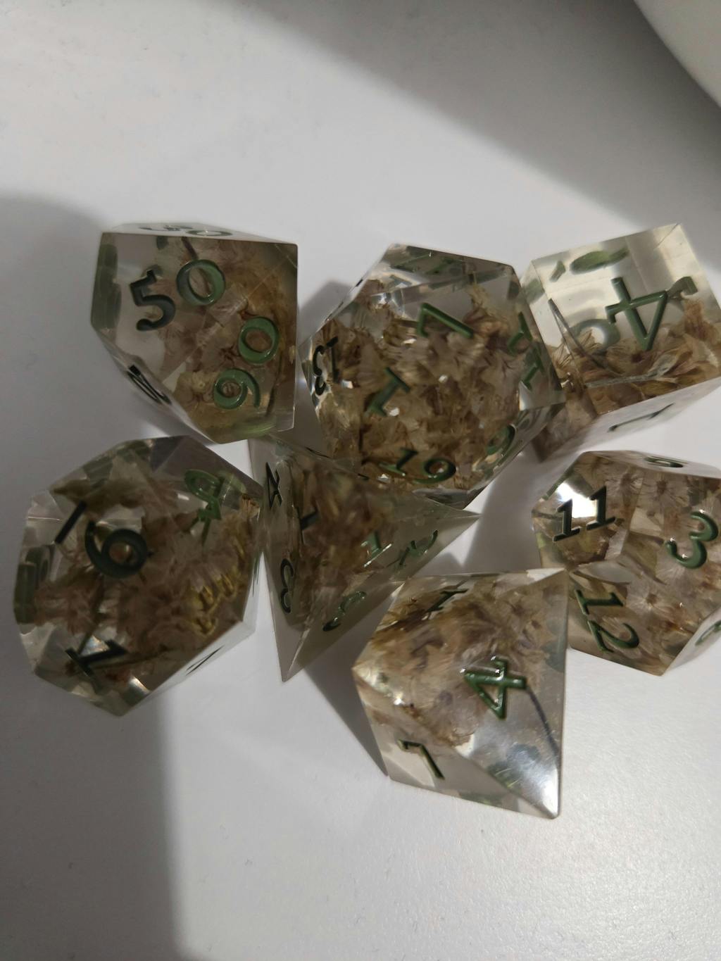 - Set of 7 sharp edged epoxy resin polyhedral dice including one of each of the following dice styles: