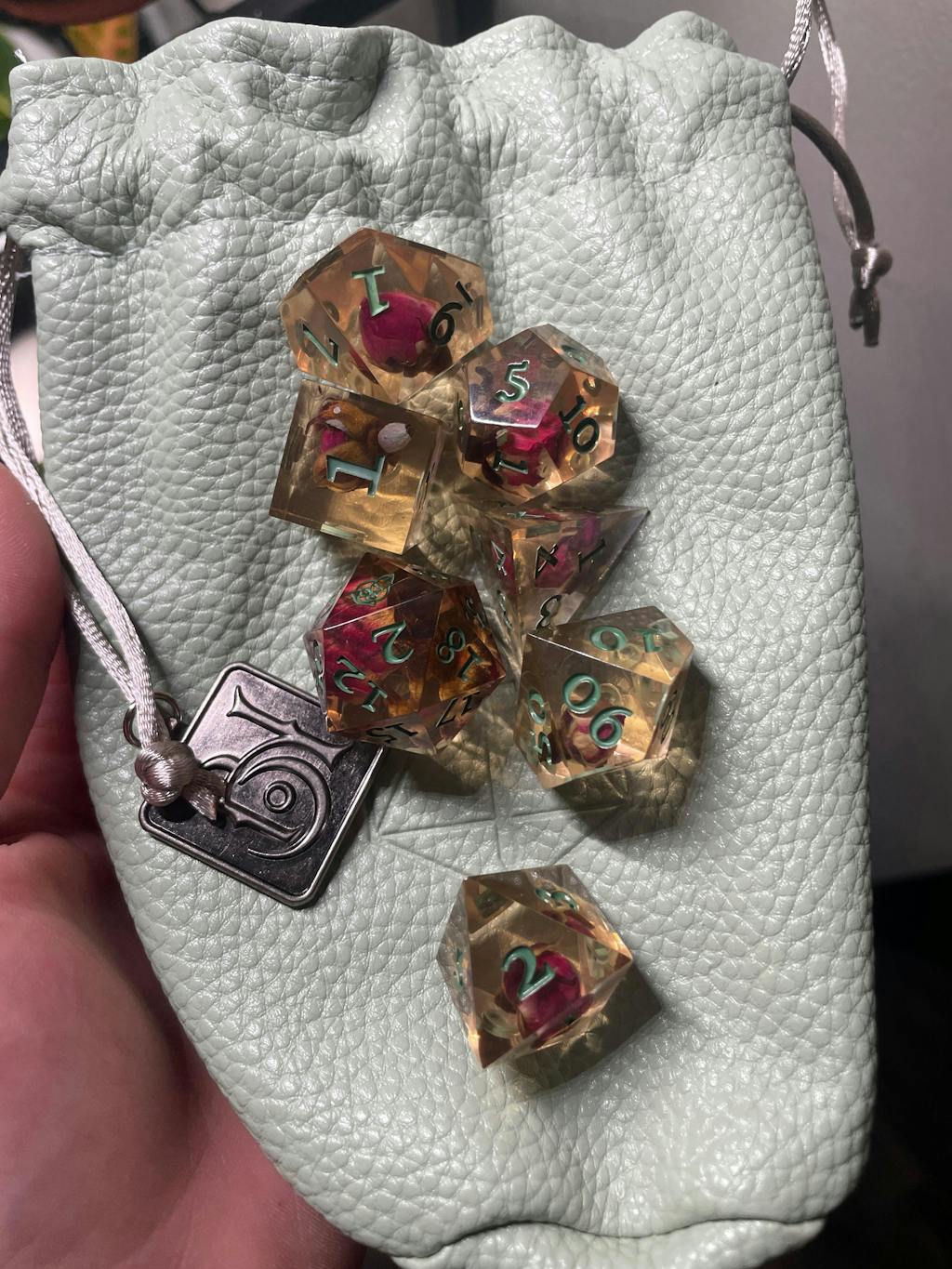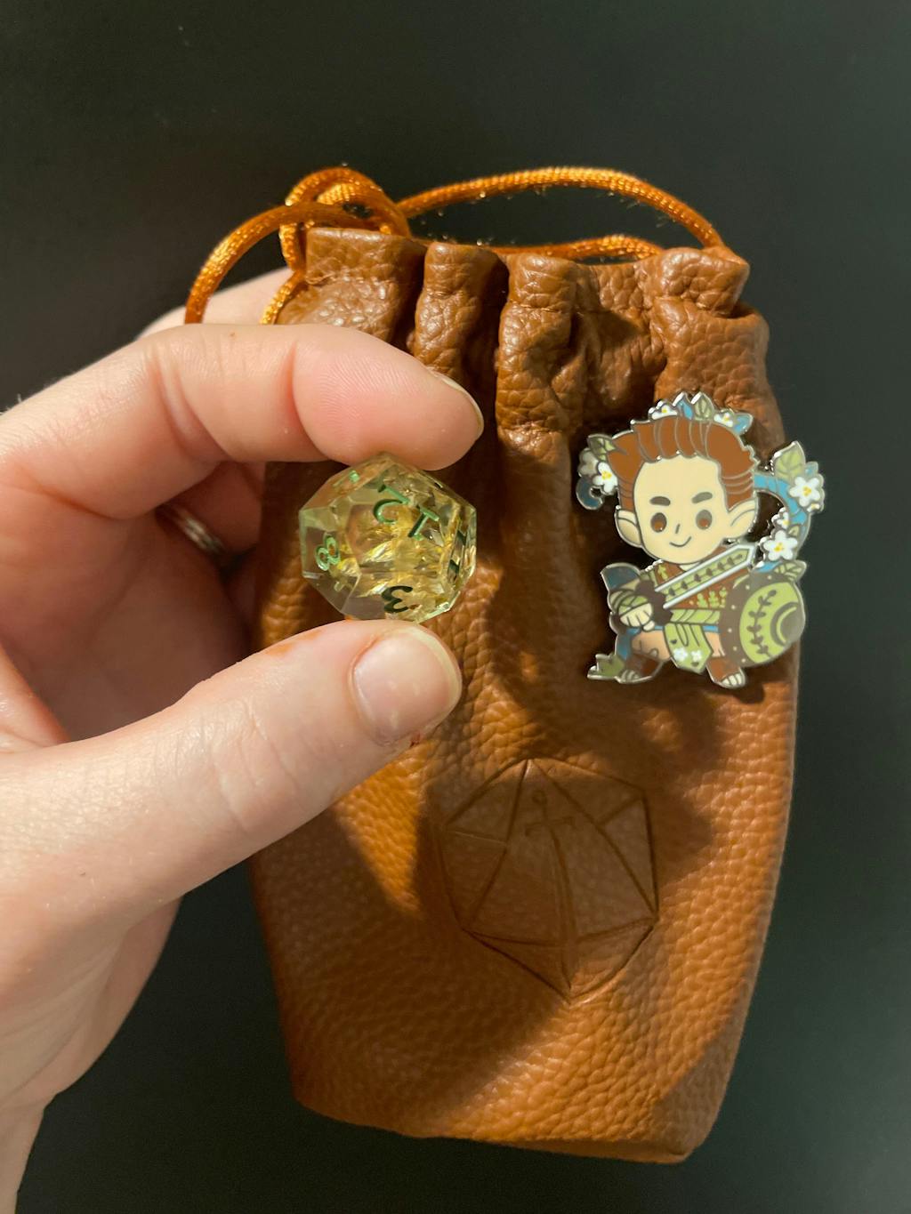 - Dice set arrives in a brown synthetic (polyurethane) leather bag with a debossed Critical Role logo, drawstrings, and light green nylon lining.