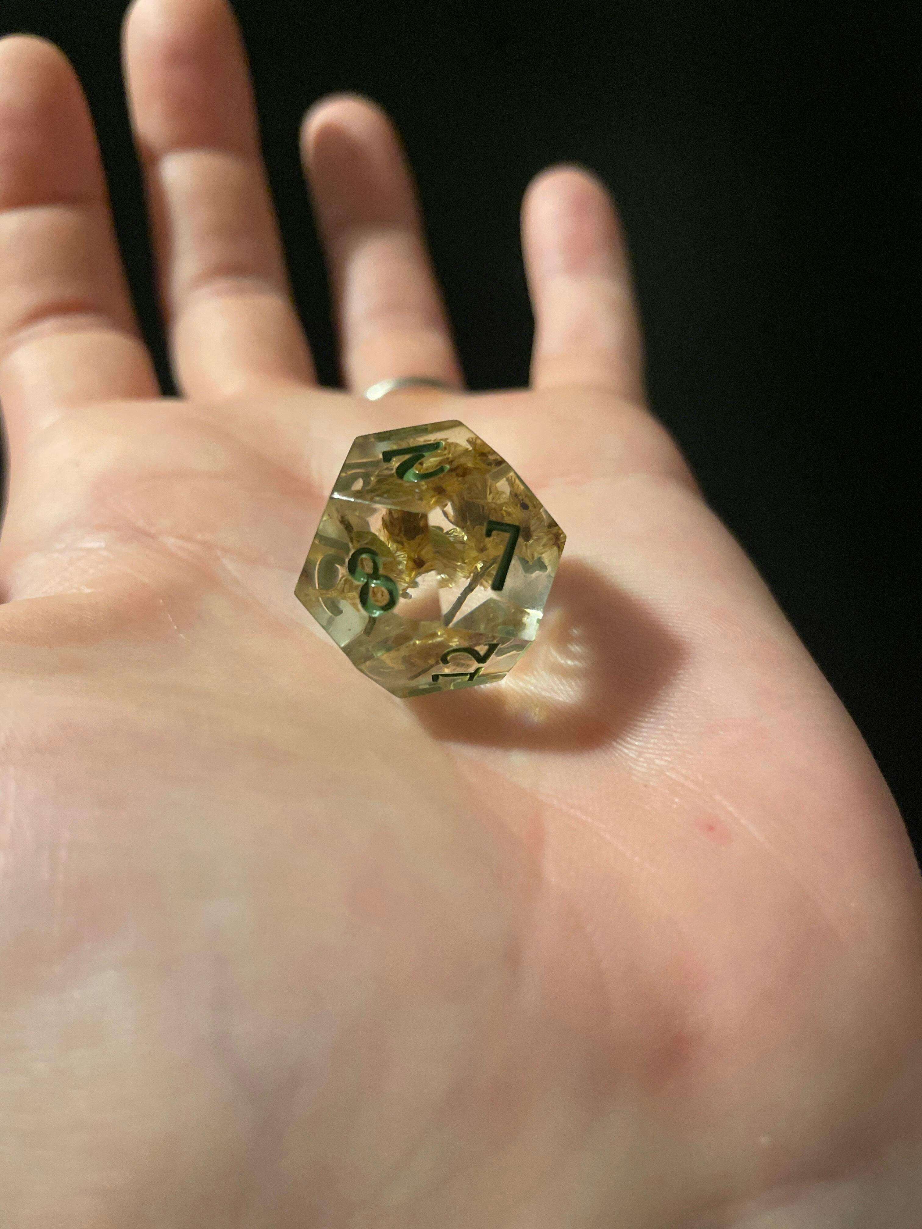 Armed with the defense of air elemental magic, this dice set is inspired by the wandering swordsman, Orym, of the Air Ashari. The sharp-edged set is translucent with white flowers inside, light green numbering, and an icon of a crescent moon on the 20-side of the d20 die.