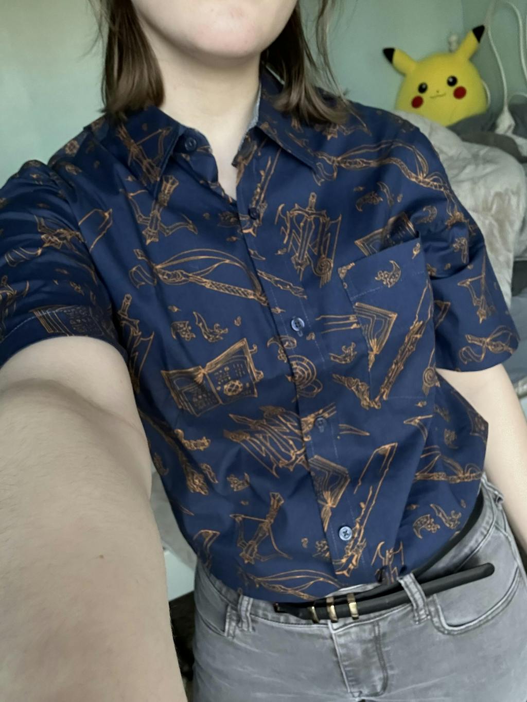 Add some nerdy-chic to your wardrobe with this snazzy button down short sleeve shirt, adorned in a pattern featuring the Mighty Nein's crest and signature weapons... Yes, books are very dangerous weapons.