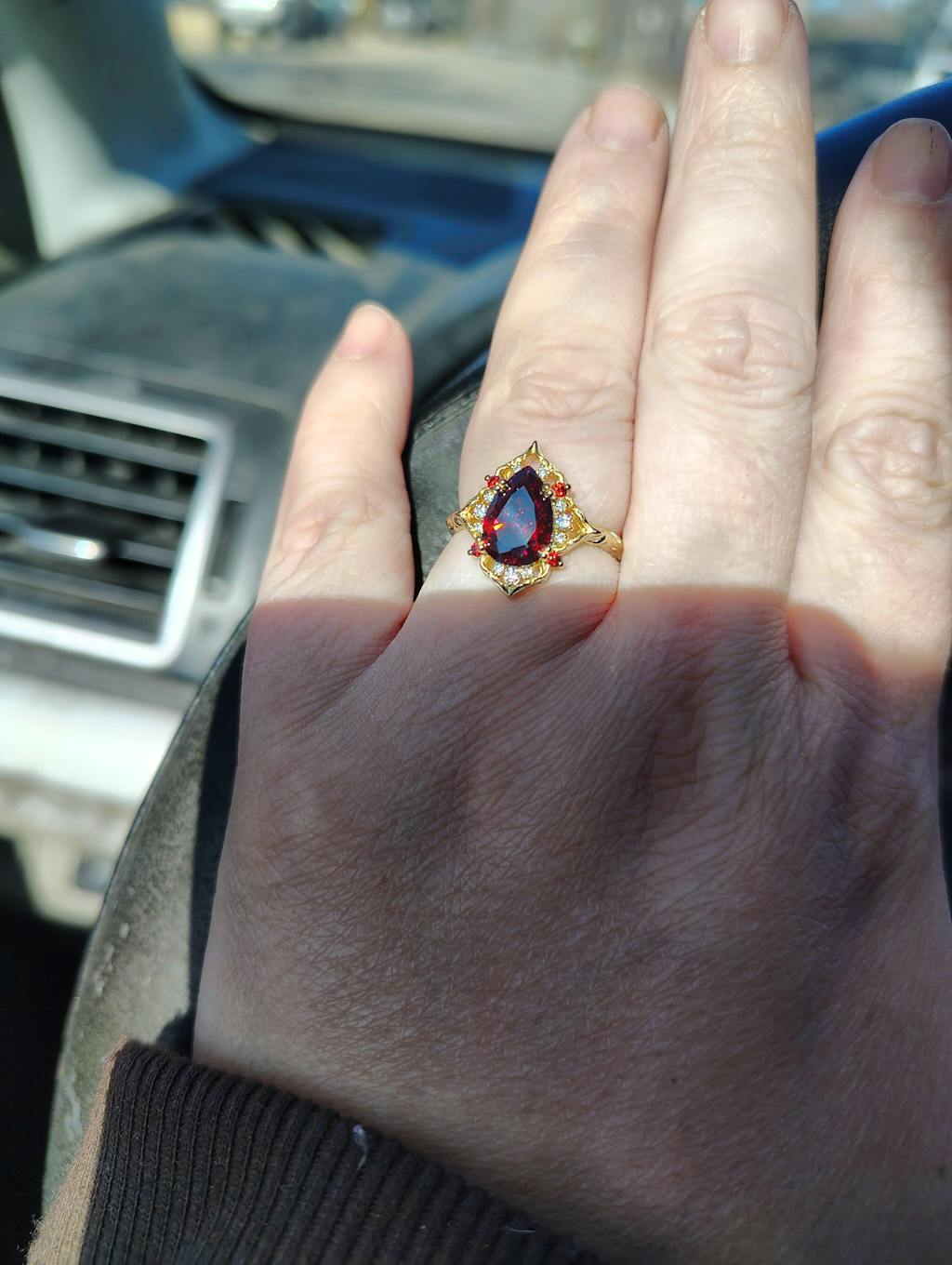At its center blazes a fiery 10x7mm pear-shaped garnet red cubic zirconia crystal, glimmering like a spark of the Ruby of the Sea herself. White and red cubic zirconia crystals adorn the arches, creating a dazzling contrast that feels both playful and regal, the perfect match for a love that doesn’t always follow the rules.