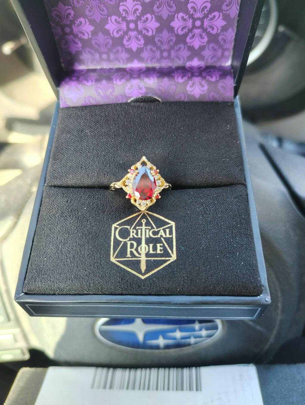 This piece of Critical Role X RockLove jewelry arrives in a sleek black RockLove jewelry box lined with our signature purple damask interior. The box is wrapped by a black printed sleeve, accented with gold metallic Critical Role branding. Inside, the piece rests on a soft black flocked insert, silkscreened with additional Critical Role artwork, and includes a premium RockLove travel pouch for safekeeping.