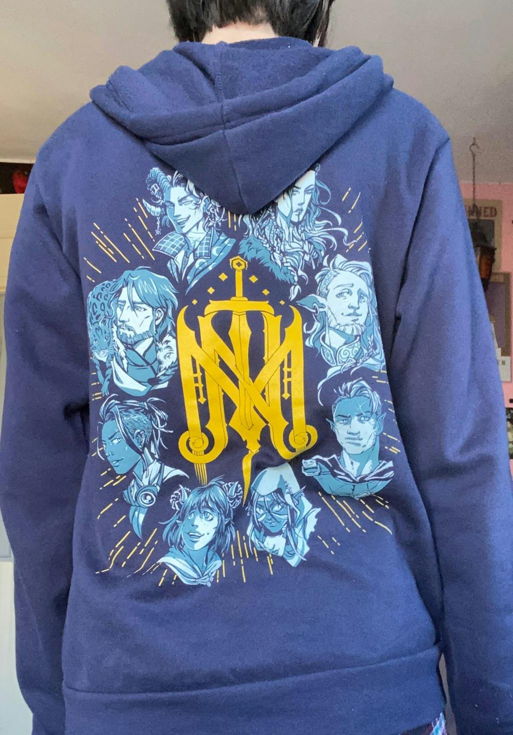 Flaunt your Mighty Nein enthusiasm rocking this super comfy hoodie featuring the Critical Role logo on the front, and a beautiful screen print of the faces of all 8 members of the Campaign 2 adventuring party arranged around their official crest.
