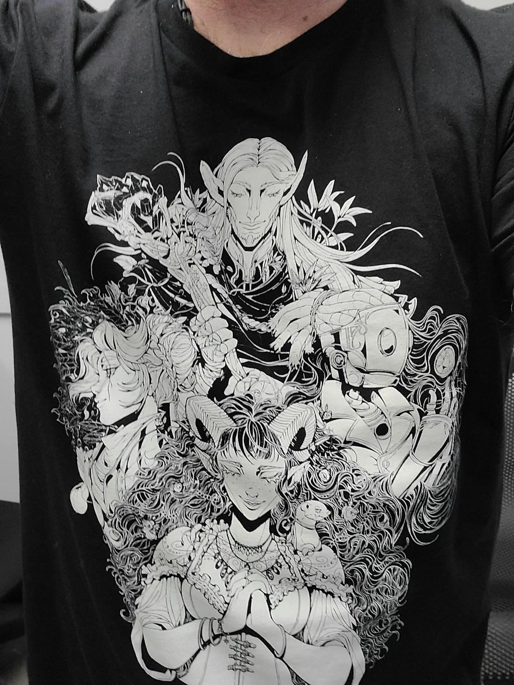 No adventure across Exandria™ is without battle scars. But no need to worry—these wonderful characters are here to mend your wounds. Add this cool and comfy t-shirt to your collection featuring a large portrait screen print of all four healers across Critical Role’s 3 campaigns: Pike Trickfoot from Vox Machina, Jester Lavorre and Caduceus Clay from Mighty Nein, and Fresh Cut Grass from Bells Hells