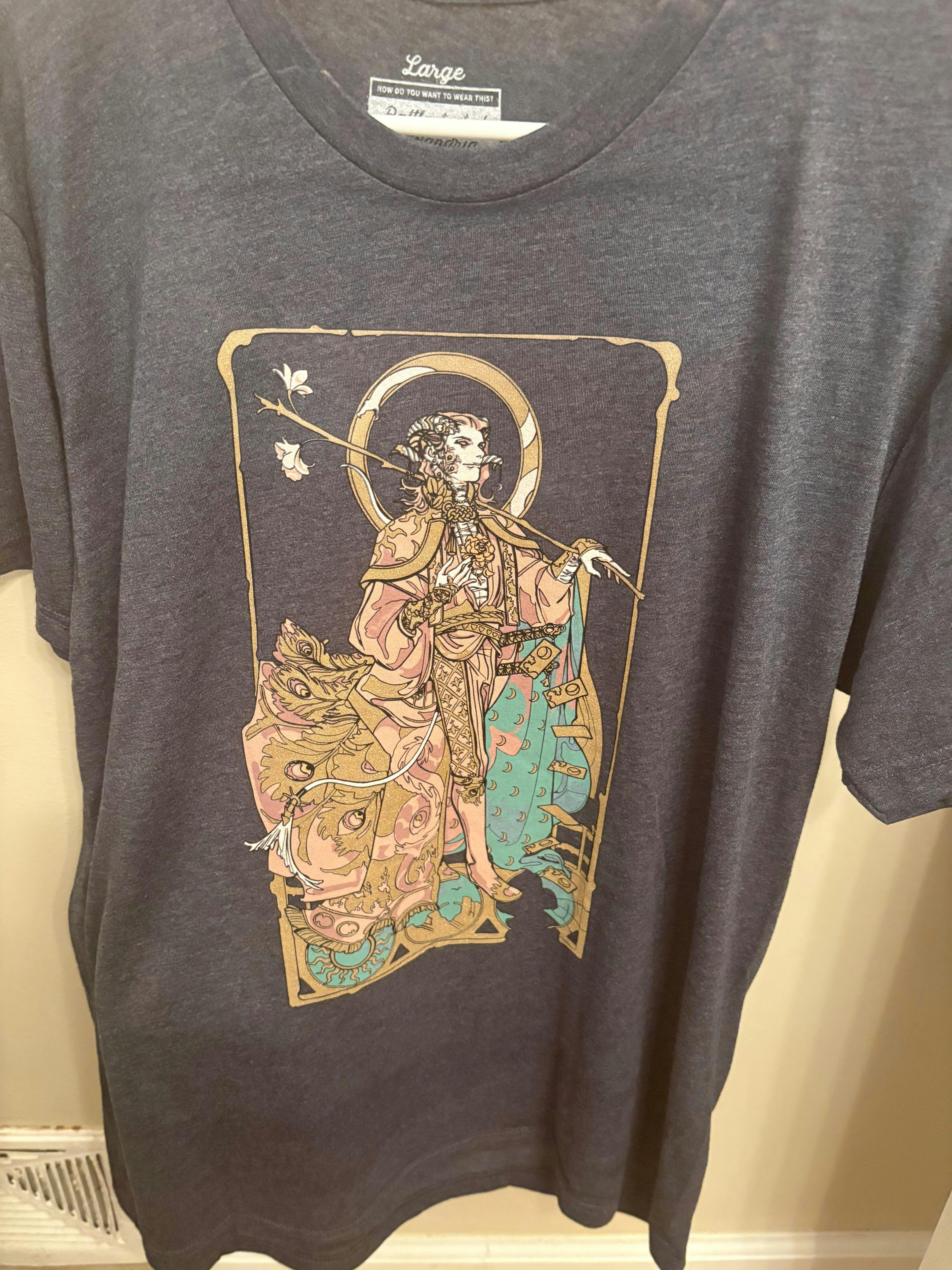 Celebrate the life and legacy of our beloved Mollymauk Tealeaf with this beautiful shirt, featuring tarot-based art of Molly as The Fool. Sparkling glitter covers the gold sections for the appropriate level of flamboyance. Long may he reign, indeed.