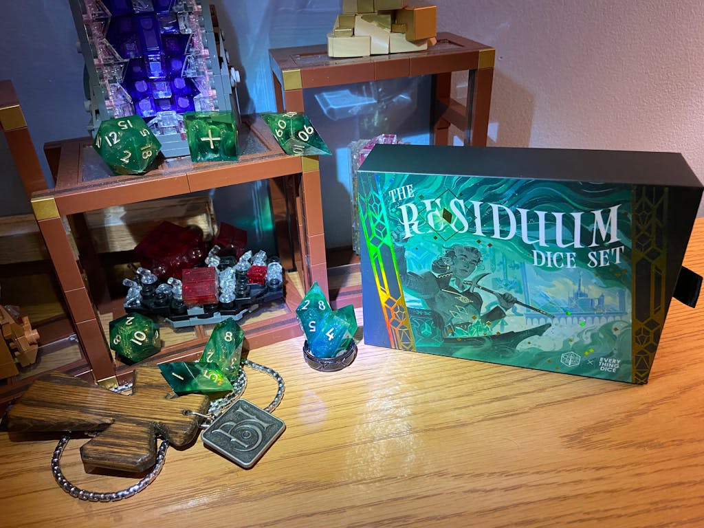 The Residuum Dice Set is the sixth set of an exclusive Critical Role collaboration with the amazing artisans of Everything Dice. Please note the exact coloration may vary between both dice and sets.