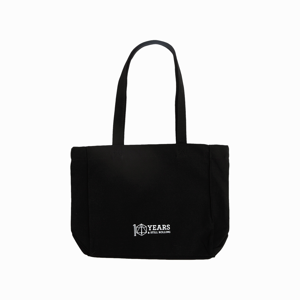 Carry your dice and goodies around in commemorative style! This black tote bag features a white screen print of the Critical Role 10 Year Anniversary Live Tour design on one side, and the Critical Role 10 Years and Still Rolling tagline logo on the other.